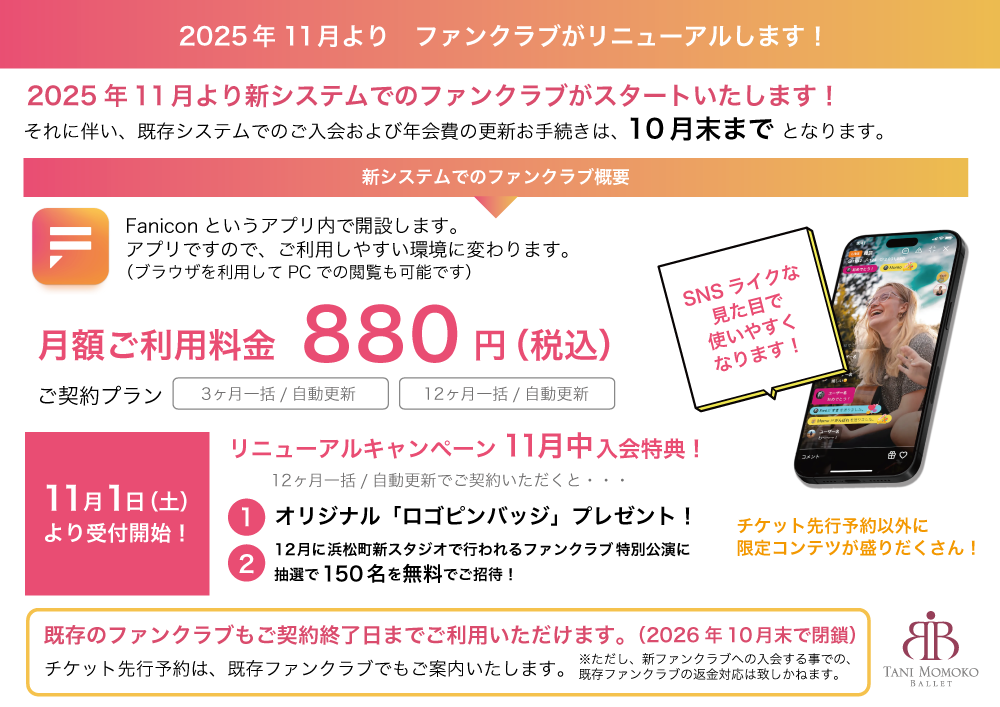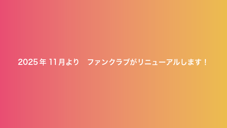 2025.10.18 2025年11月よりファンクラブがリニューアルします。 新ファンクラブでのご契約料金例 3ヶ月一括払(自動更新) ¥2,640(税込) 12ヶ月一括払(自動更新) ¥9,504 (税込) ※12ヶ月ご契約の方は10%FF ぜひこの機会に新ファンクラブのご入会をご検討ください! 新ファンクラブの入会方法については、後日ご案内させていただきます。